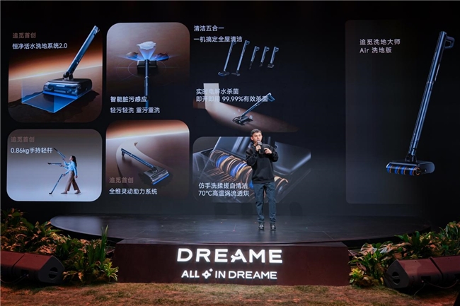 邱鹏表示,追觅吸尘器始终以用户痛点为研发落脚点。在收集全球首款吸力洗地吸尘器V30 Pro用户反馈的基础上,追觅推出专注湿清洁场景的Air洗地版。该产品应用恒净活水洗系统,集成电解水、助力轮等组件,搭配AI灵捕机械臂与智能脏污感应模组,高效解决水渍残留与清洁效率问题;依托Air系列超轻主机及配套附件,实现洗地、除尘、除螨等全屋5合1清洁。此外,湿拖支架升级70°C高温烘干与滚刷自清洁功能,优化附件收纳设计,进一步提升使用与收纳便捷性。